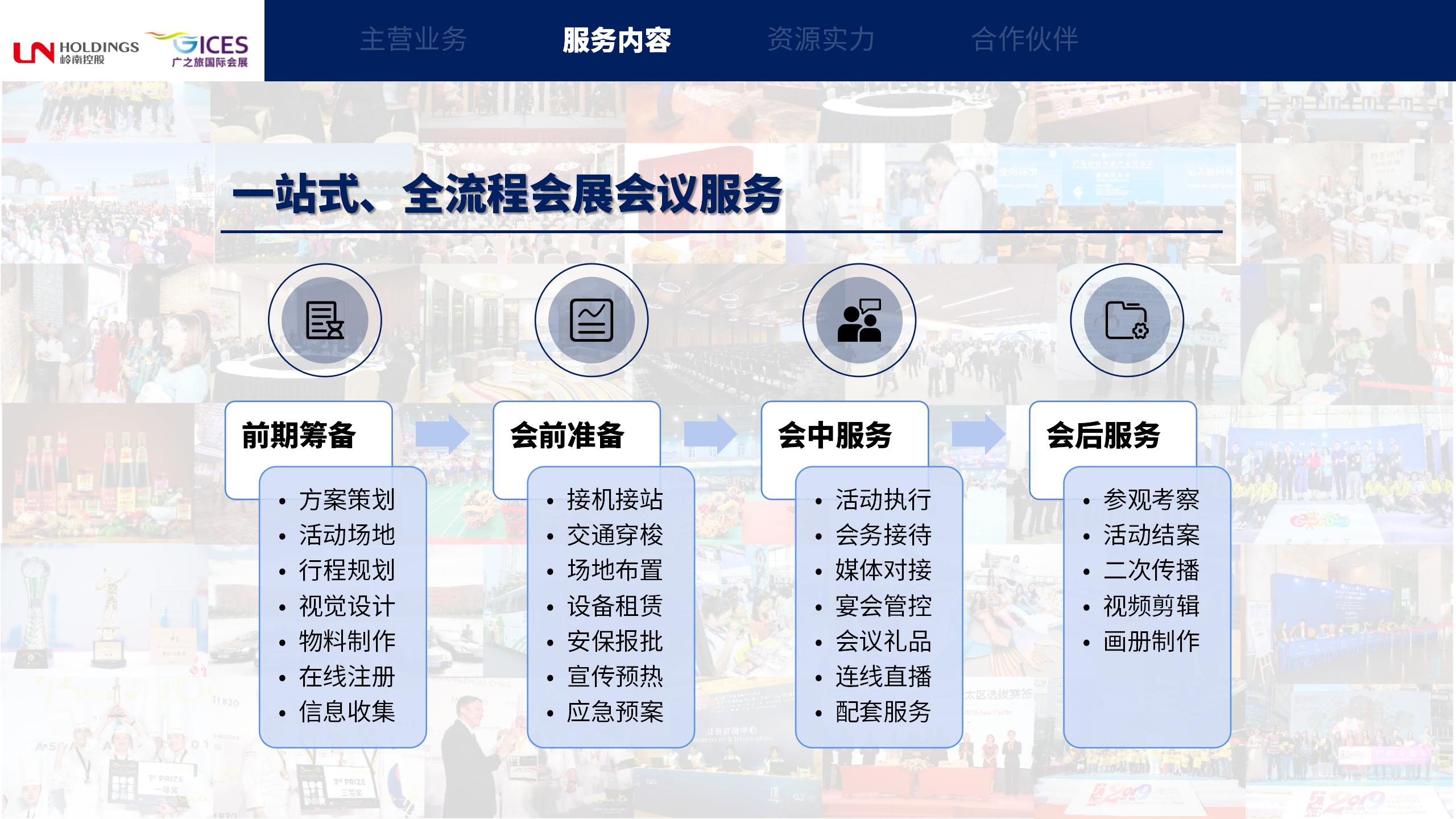 依托嶺南商旅集團(tuán)吃住行游購娛“一體化”產(chǎn)業(yè)鏈優(yōu)勢,具備優(yōu)質(zhì)的會展場館、酒店、商務(wù)考察、交通出行、宴會餐飲服務(wù)資源。